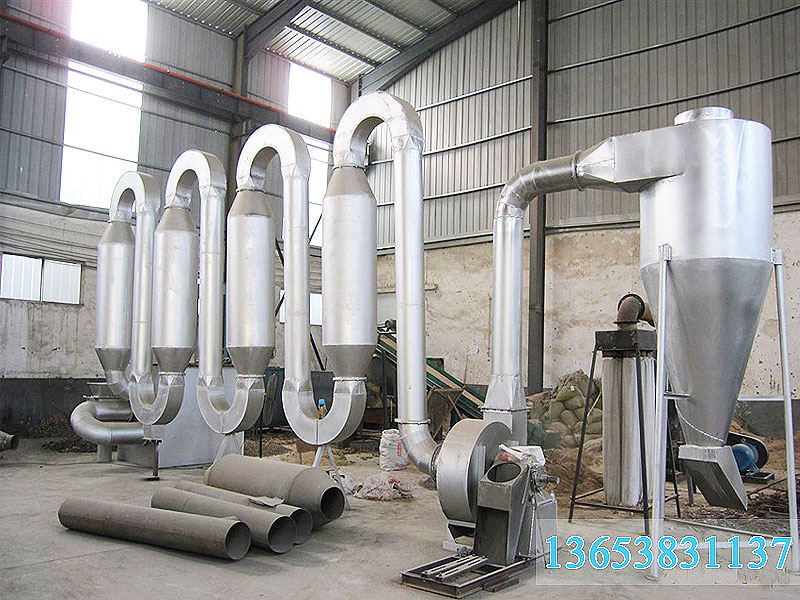 鋸末或者木屑直接由加料器加入氣流干操管中、 空氣由鼓風機送人燃燒爐,經過加熱,物料進入氣流烘干機管的底部。高度的熱氣流,能夠使物料加速分散懸浮在氣流中,物料加速的干燥之后,被輸送的過程中完成對濕物料的干操。